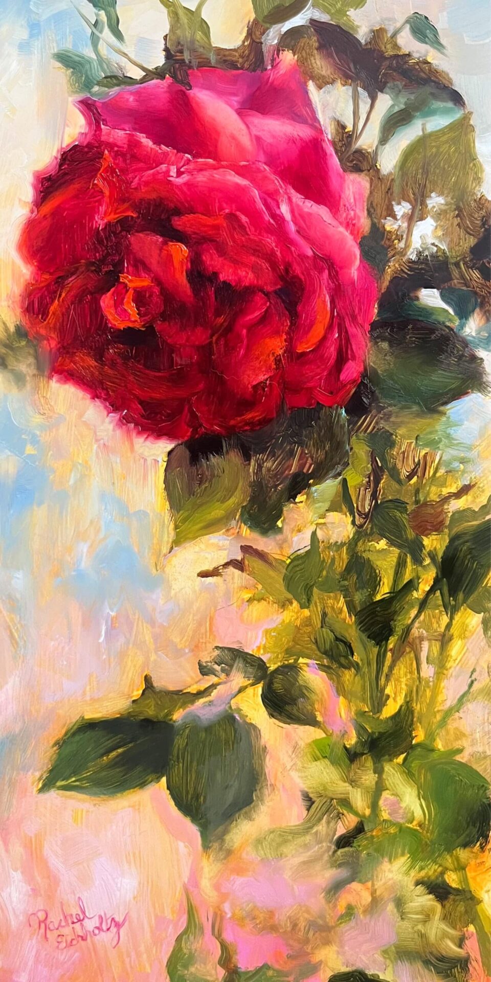 It is one thing to render a subject exactly as we see it, and another to capture the impression or feeling a subject gives us. Alla Prima is an advanced style of painting because every stroke of the brush must be intentional and specific. The messy brushstrokes are not random at all, but hold enough precisely placed information to suggest the feeling of drooping petals and winding leaves. By giving only an impression of the rose rather than every detail, the viewer is invited to develop their own connection to the subject.