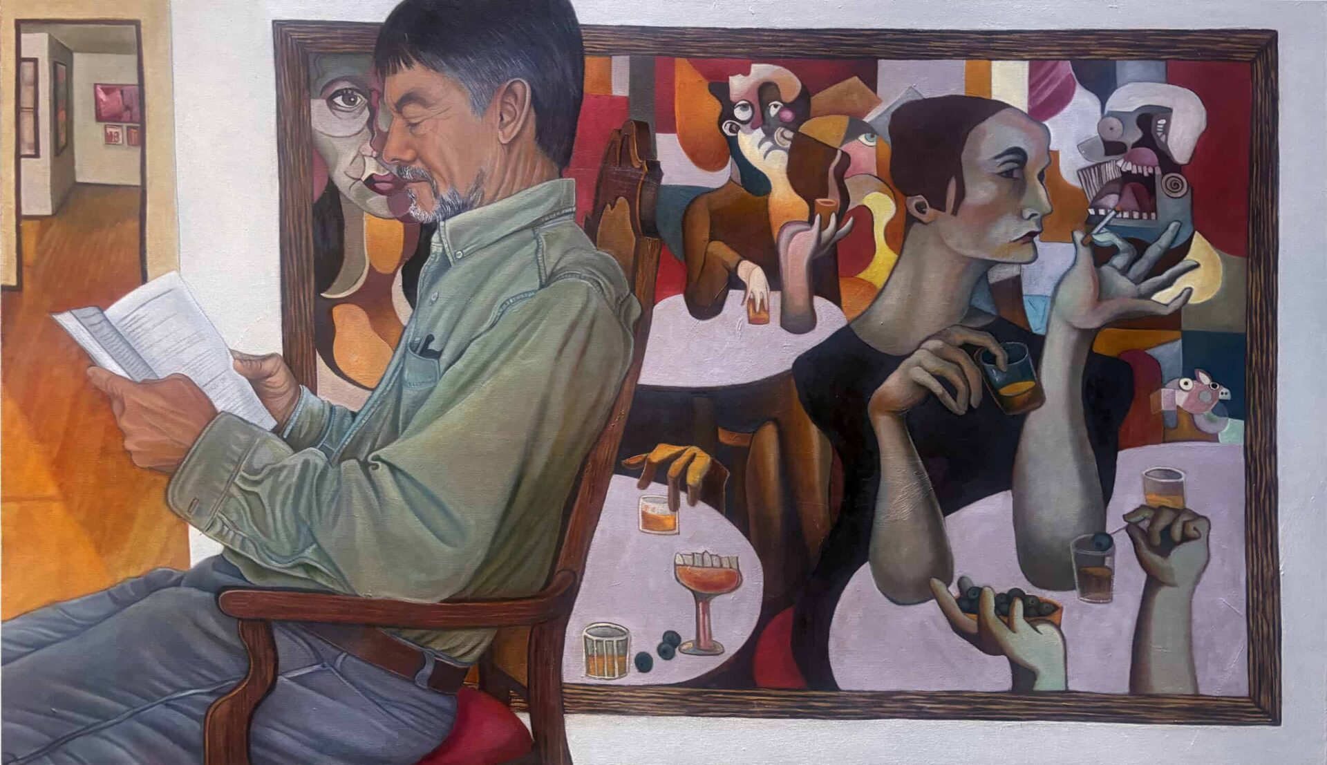 perceptions of the truth or their personal reality. My husband modeled for the image of a man reading in a gallery space, juxtaposed with a painting behind him showing a more chaotic abstract bar scene. I liked the idea of using a painting as a