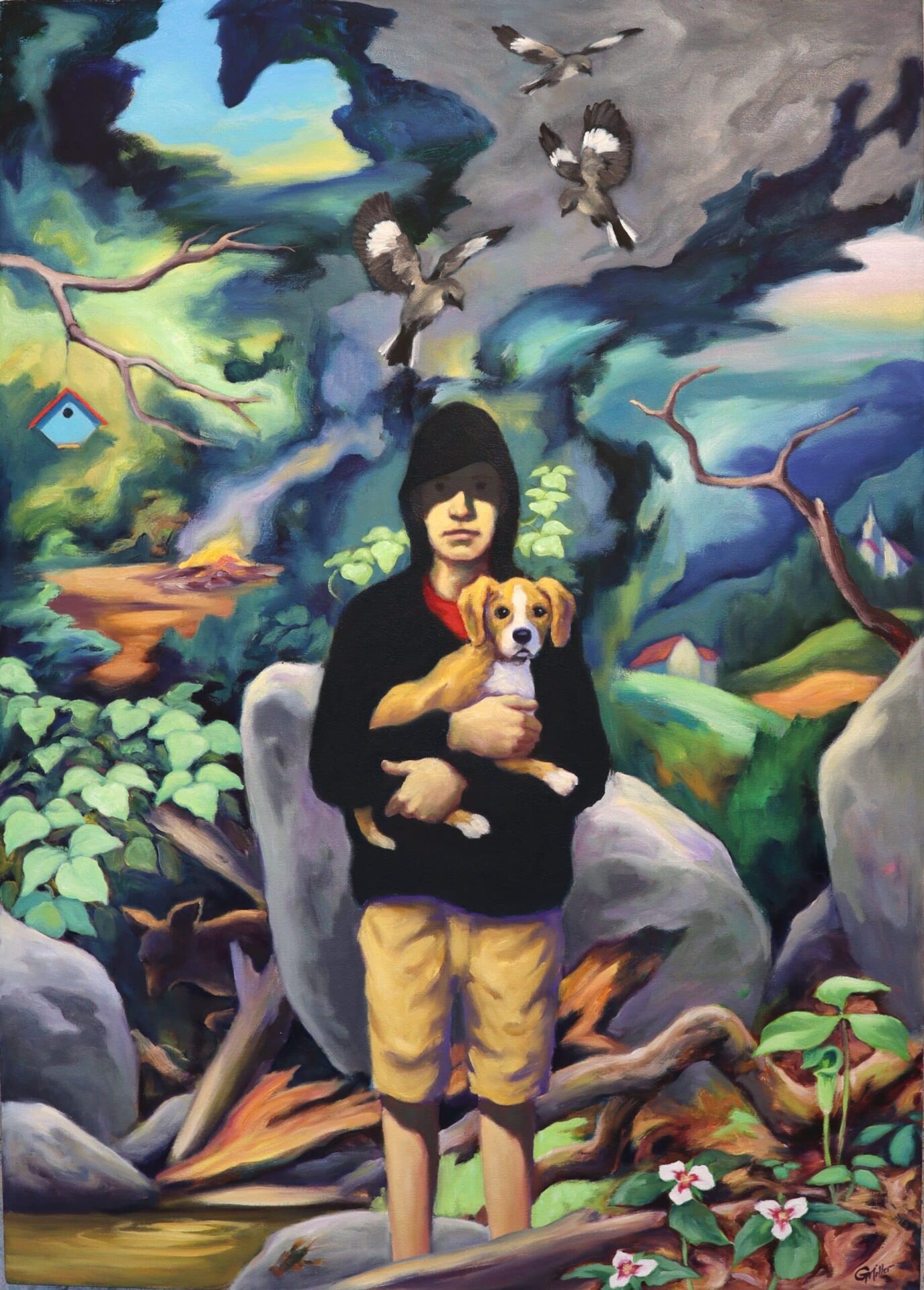 This piece is part of the Appalachian Birdsong series which is drawn from my experience growing up in the mountains of Appalachia and a lifetime of wandering the mountain trails of the region. These are fictions created from various sources, some remembered, some documented from hikes, some invented. The natural world was playground and sanctuary for me in my youth and as an adult I would come to think of it as the “real” world apart from cultural inventions. I wanted the work to embody these sentiments as well as suggest sounds, and reflections on cycles of life, death, and regeneration, the figure being an integral part of the story. It is not about Appalachia, but about being Appalachian.