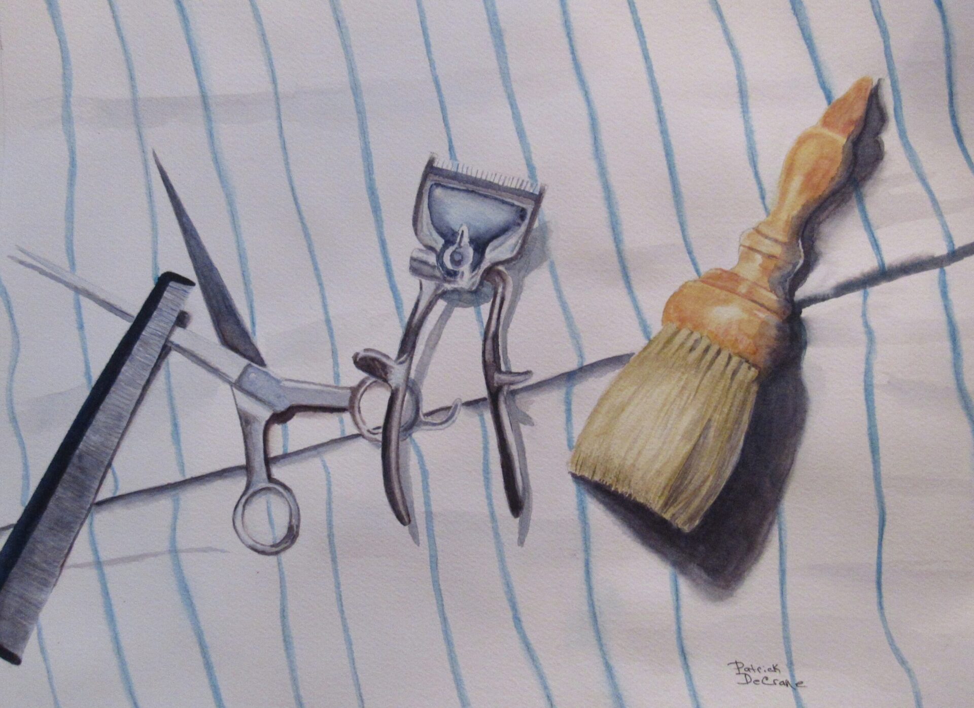 This painting is a tribute to my Dad, Clem DeCrane, Sr. who was a butcher by trade. With 5 boys in our family it was necessary for him to cut our hair because of the cost. We boys felt people could tell our father was a butcher by the way he cut our hair. While the manual clipper were never used, they were always in his tin can of barber tools. Along with the manual clippers, the scissors and brush were his original tools.