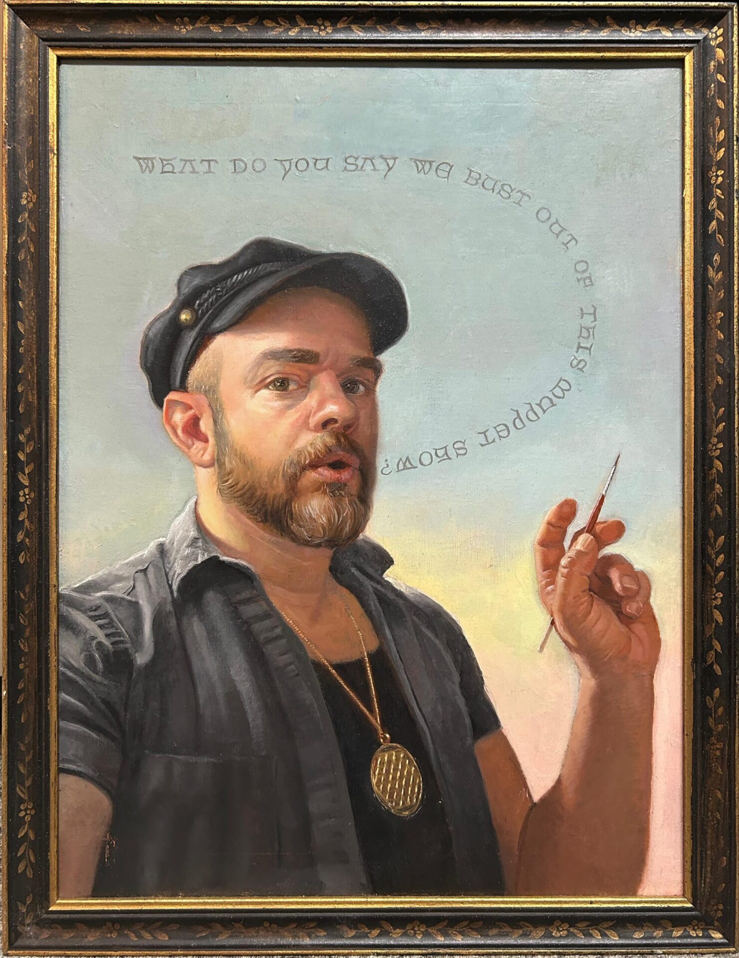 This self-portrait was inspired by a Northern Renaissance tradition of portraiture, in which words curled out of the subject’s mouths, usually religious messages. I searched my mind for esoteric messages I might like to share this way. When this one popped into my head, I couldn’t stop laughing, and yet, nothing could more accurately express what I wanted to say.
